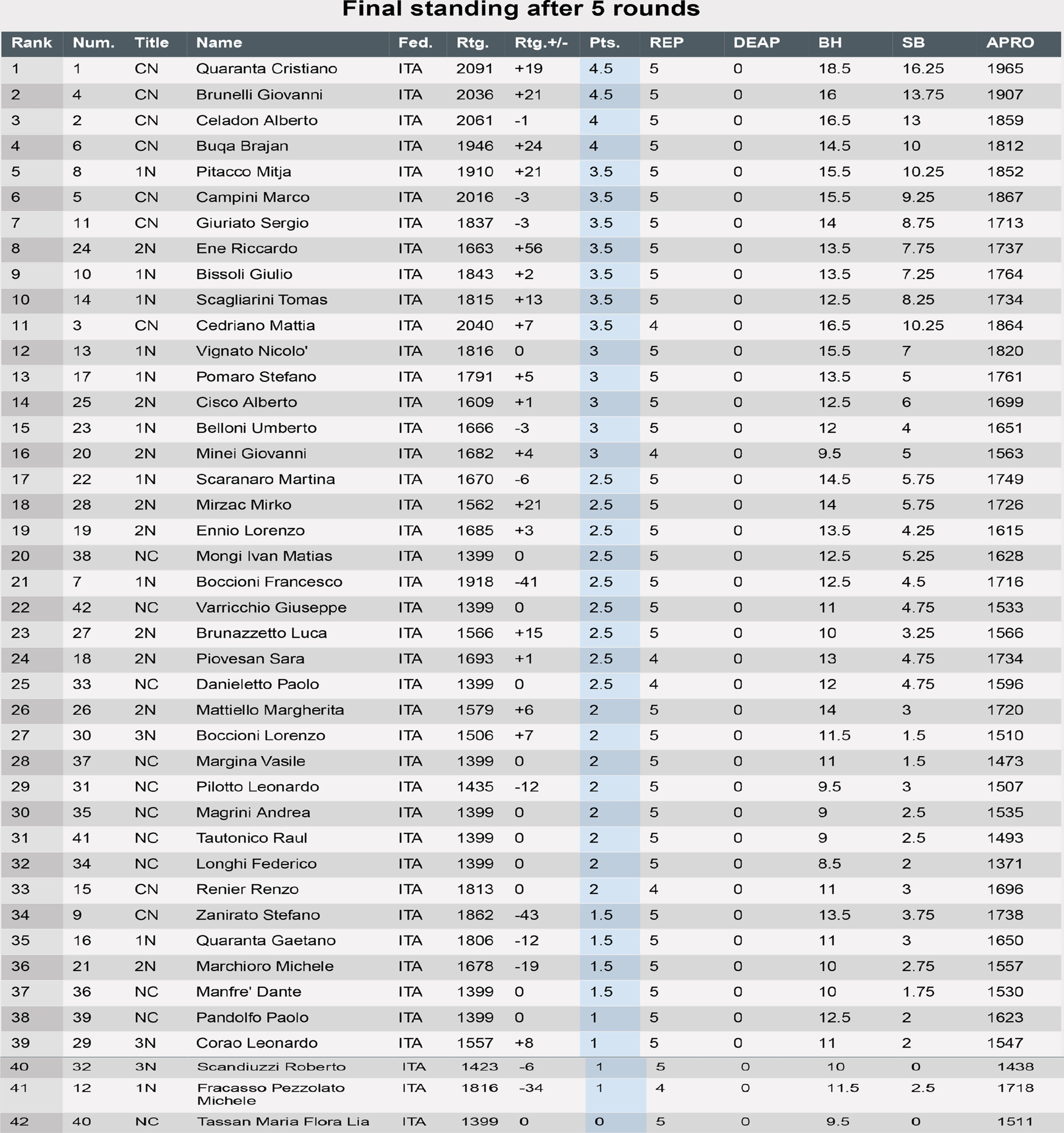 La classifica generale ha visto Mitja piazzato al 5 posto su 42 schierati al cancello di partenza, ma in vetta ai giocatri della provincia di Rovigo che si presentavano in 8.